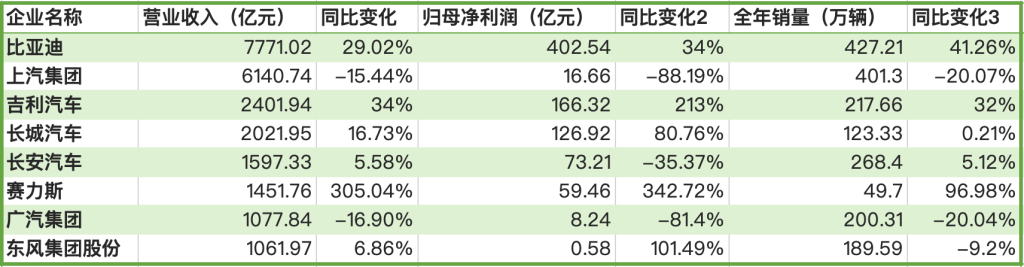 车企的销量大宗是营收最大影响身分。具体来看,比亚迪以427.21万辆的收货稳居第一,同比增长41.26%;上汽集团全年销售401.3万辆,同比下落20.07%;安稳全年销量217.66万辆,同比增长32%;长安汽车销量268.4万辆,同比增长5.12%;广汽集团全年销售200.31万辆,同比下滑20.04%。长城汽车销量123.33万辆,同比仅微增0.21%;赛力斯全年销量49.7万辆,同比增长96.98%。东风集团股份销量下滑9.2%。